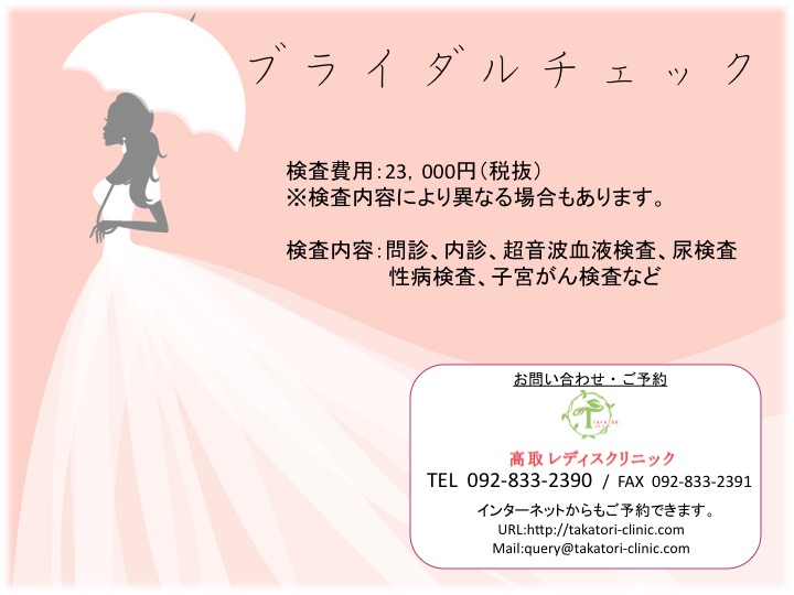 ブライダルチェックとは、ご結婚を控えている女性を対象とした妊娠や分娩に影響を与える病気の有無を検査し、早期発見・早期治療を目的としています。